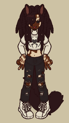 Kaitlyn is POC, with dark brown wavy thick braids that are put up into two pigtails, occasionally being taken out of the braids and the ponytail in different styles, and bangs to cover her eye. she has black eyes, and of course, her fluffy tail and wolf ears to match her hair color. she has Vitiligo, making her stand out with her darker appearance.
